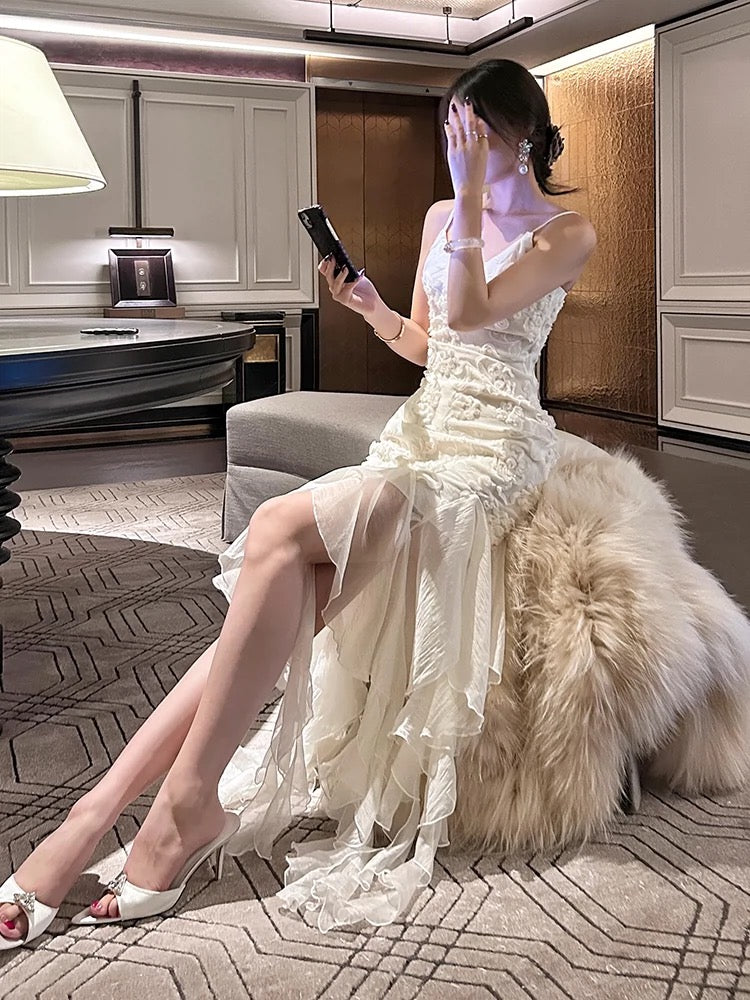 Pretty Mermaid Spaghetti Straps White Floral Prom Dresses Long Evening Gowns P2354