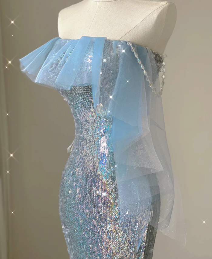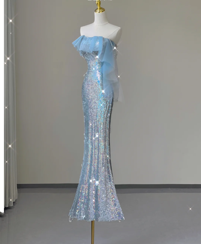 Pretty Mermaid Strapless Blue Sequin Long Silver Prom Dresses Evening Dresses DP450