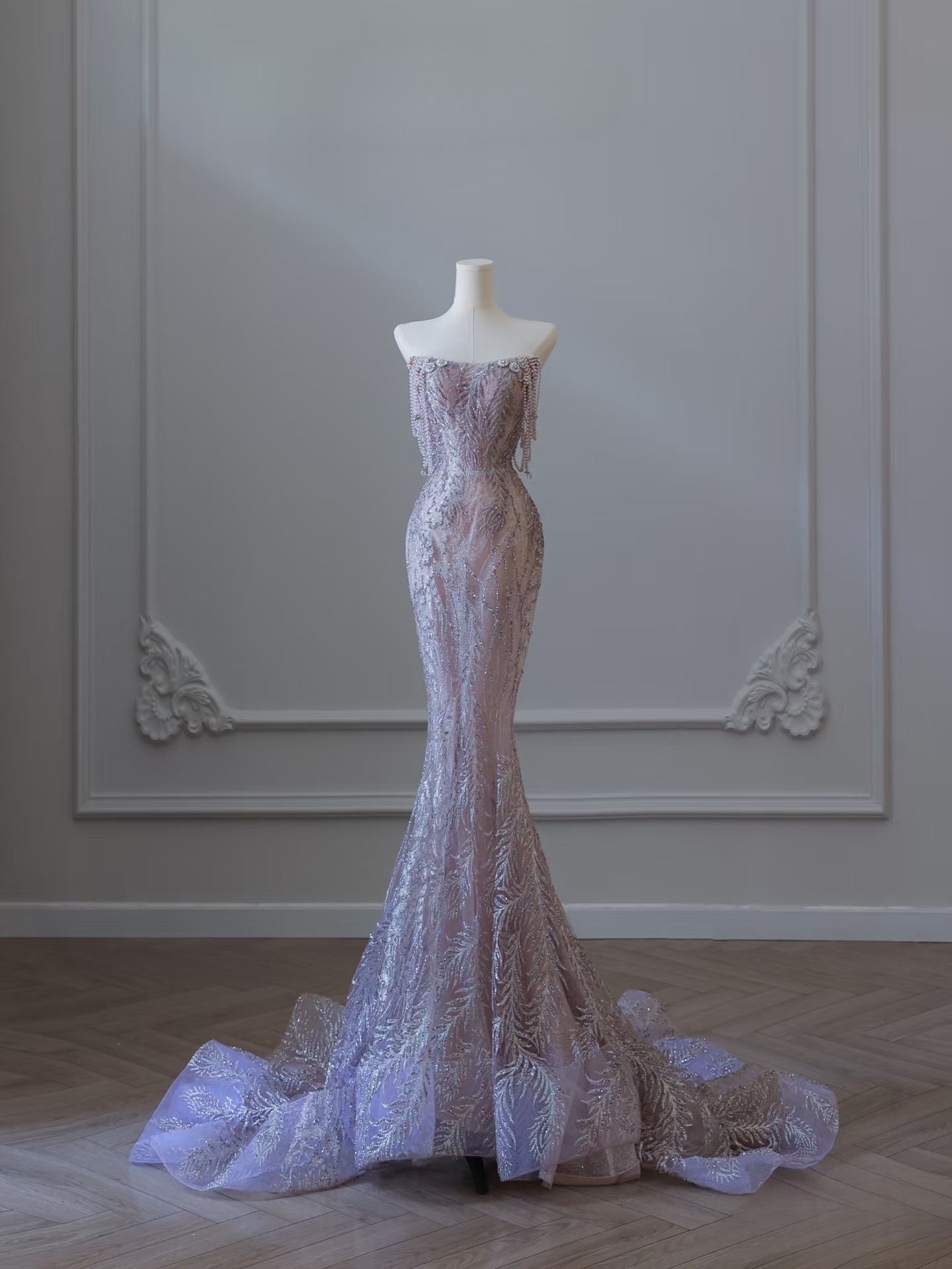 Pretty Mermaid Strapless Lilac Sequin Beads Long Prom Dresses Formal Evening Dress SD2334