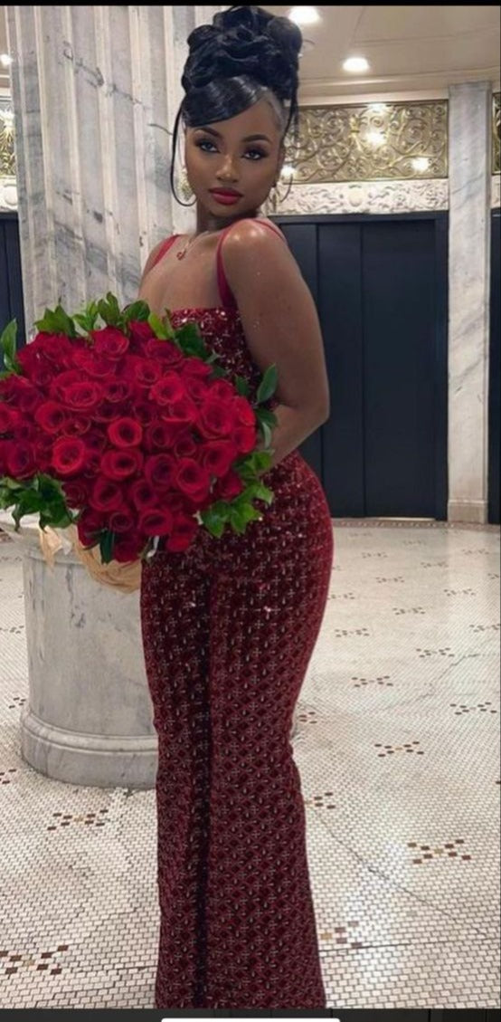Pretty Mermaid Straps Wine Red Velvet Long Prom Dresses Black Girl Graduation Dress D2545