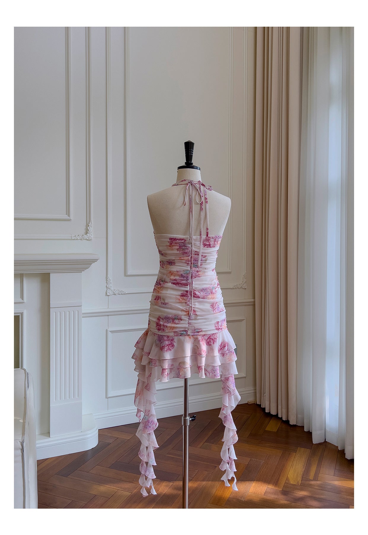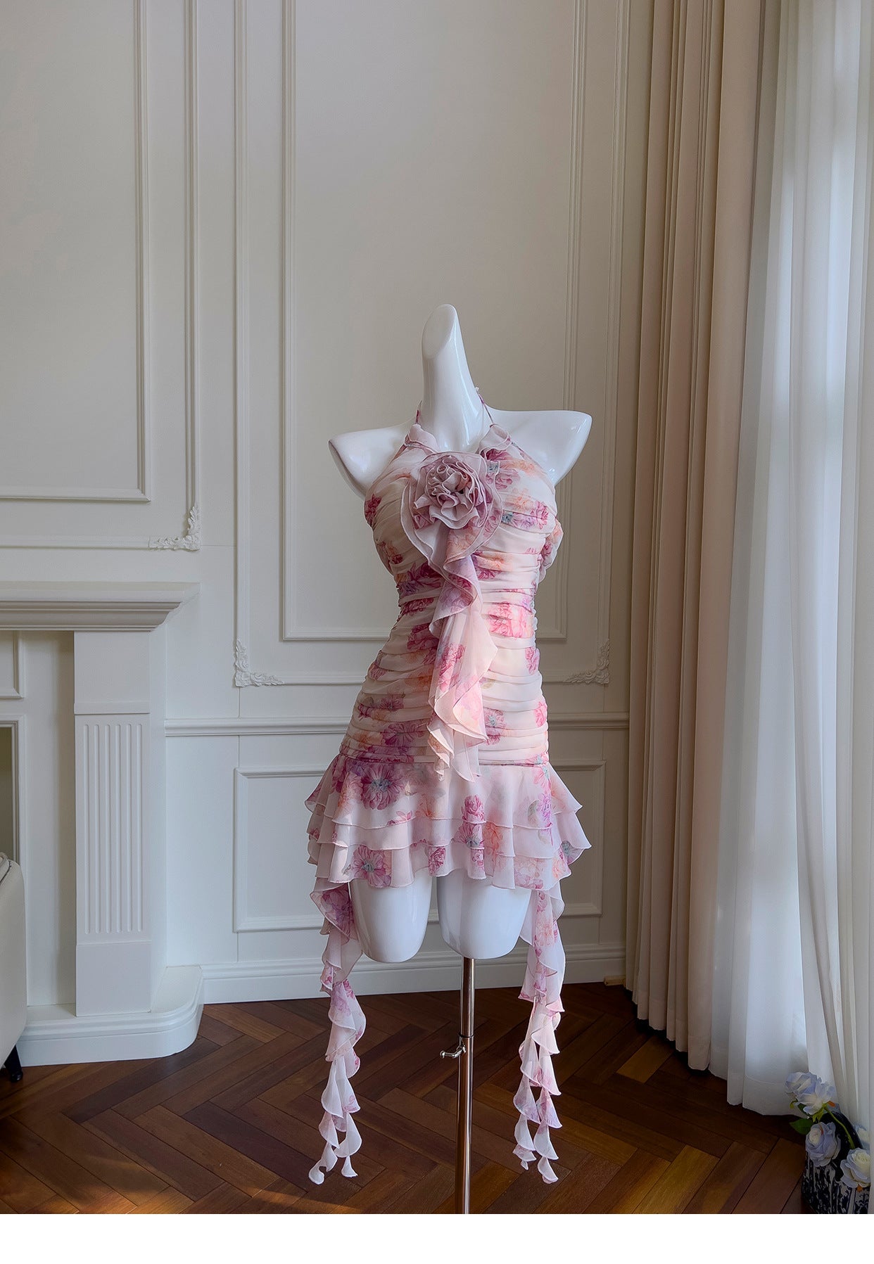 Pretty Sheath Halter Pink Floral Chiffon Short Formal Homecoming Dresses Middle School Short 21st Birthday Outfits Graduation Dress Mini Cocktail Dresses DH2289