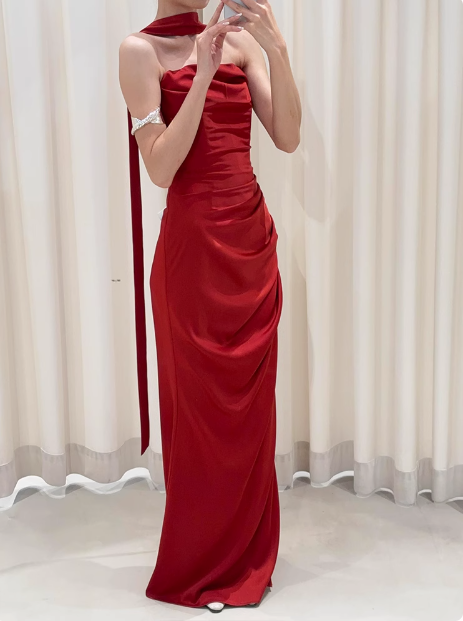 Pretty Sheath Strapless Burgundy Satin Prom Dresses Formal Summer Wedding Guest Dresses Wedding Guest Outfits With Scarf DP2258