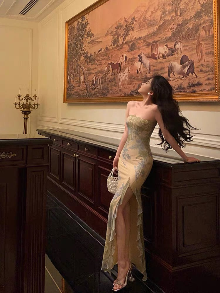 Pretty Sheath Strapless Floral Slit Long Prom Dresses Birthday Outfits SD592