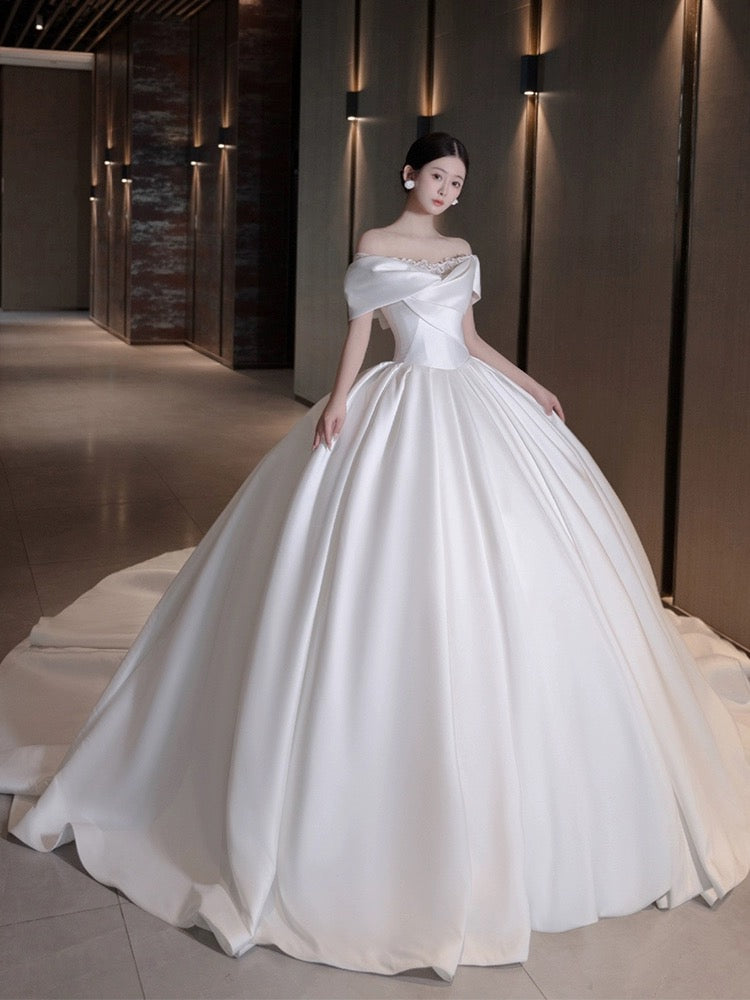 Pretty Wedding Dress Ball Gown Off The Shoulder White Long Satin Wedding Dresses Bridal Gowns Brides Gown DH109