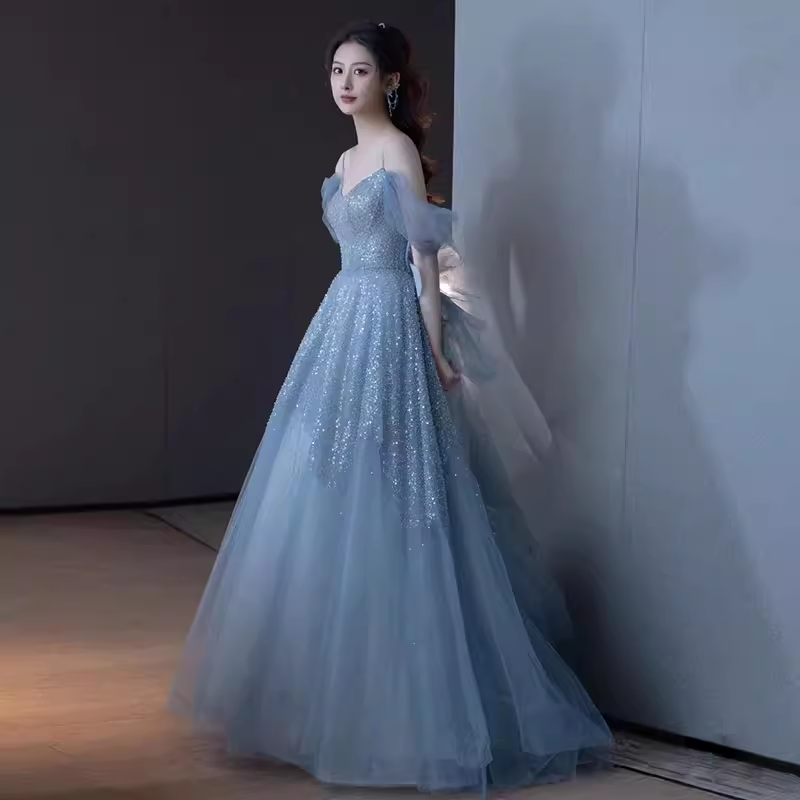 Princess A line Blue Sequin Long Prom Dresses P1009