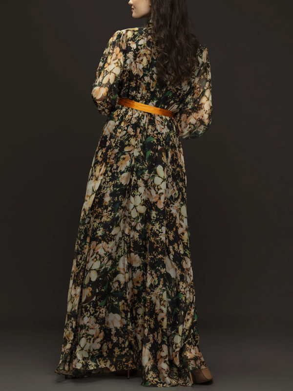 Printed Long Sleeves With Lace Up Maxi Dress