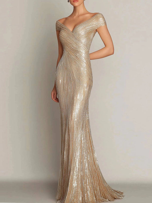 Prom Party Gold Gown V-Neck Off-Shoulder Beaded Maxi Dress