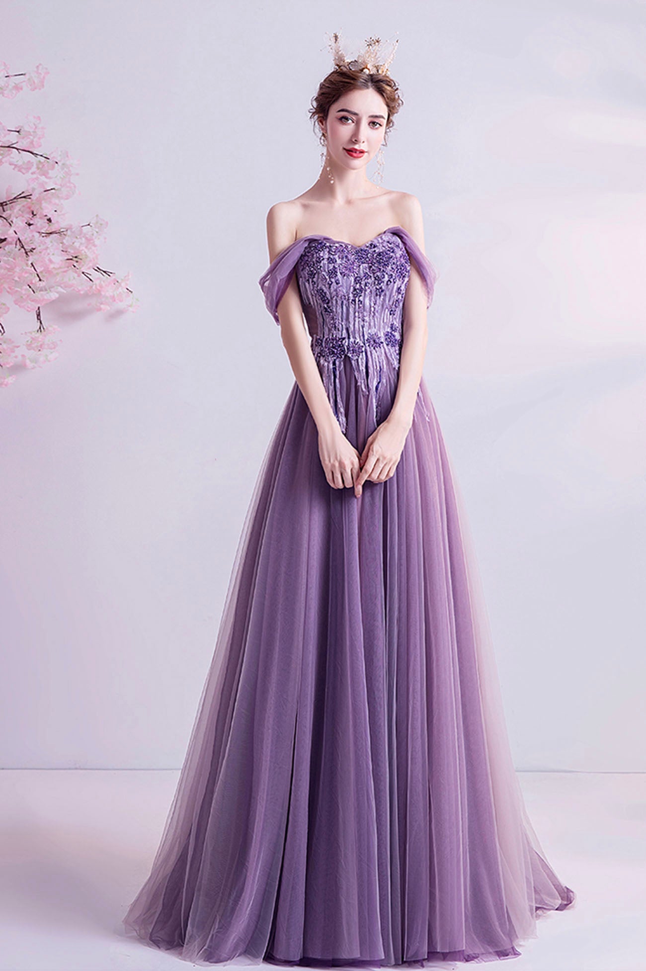 Purple Lace Long A-Line Prom Dress, Off the Shoulder Floor Length Formal Dress