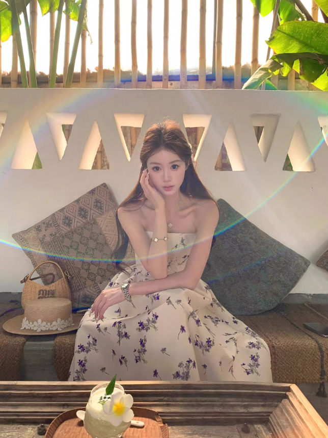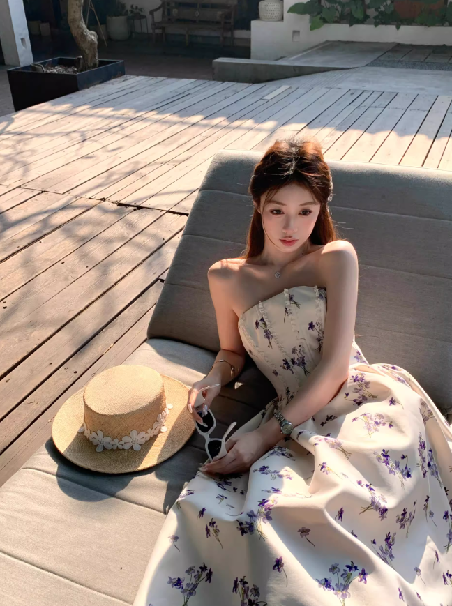 Purple Print Floral A Line Strapless Satin Long Prom Dress Party Dress Birthday Dress SH3756