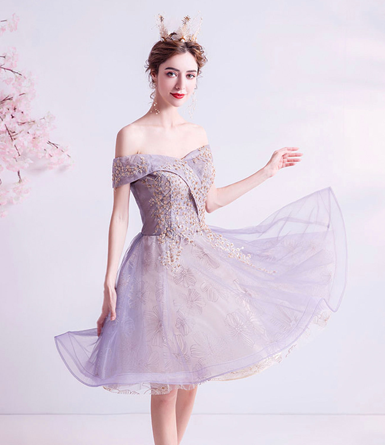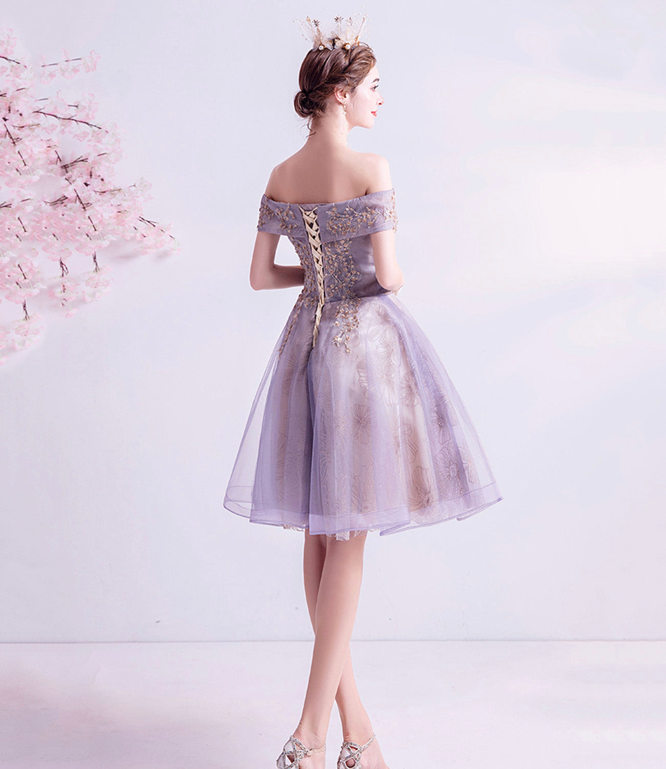 Purple tulle lace short prom dress homecoming dress