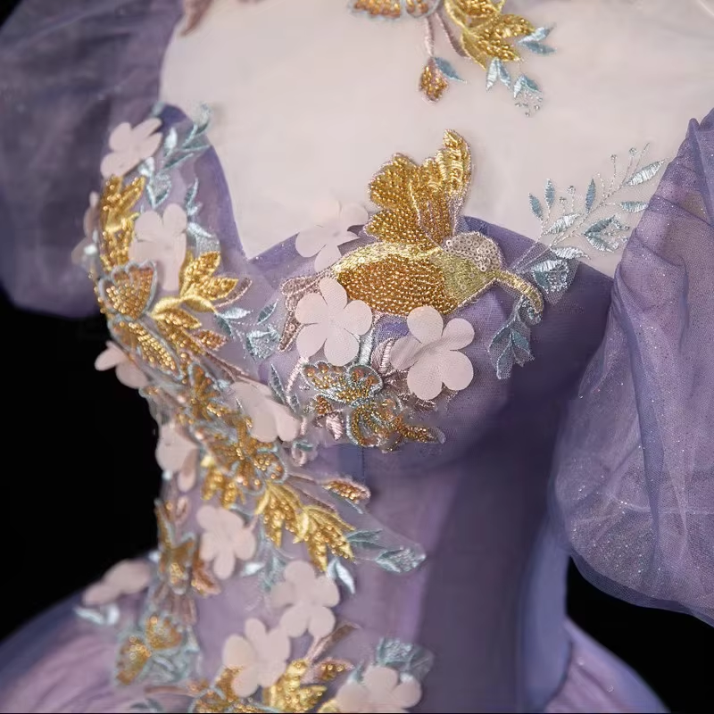 Purple Tulle Puff Sleeve Appliques Quinceanera Dress Evening Dress fg6750