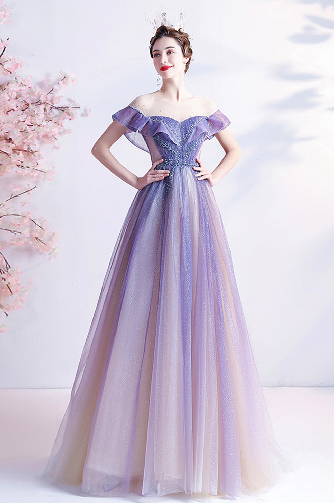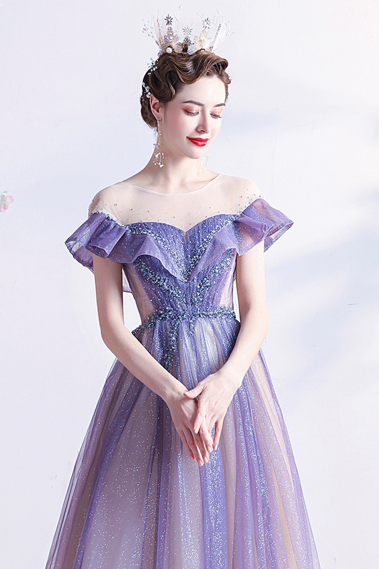 Purple Scoop Neckline Tulle Long Prom Dress, A-Line Formal Evening Dress