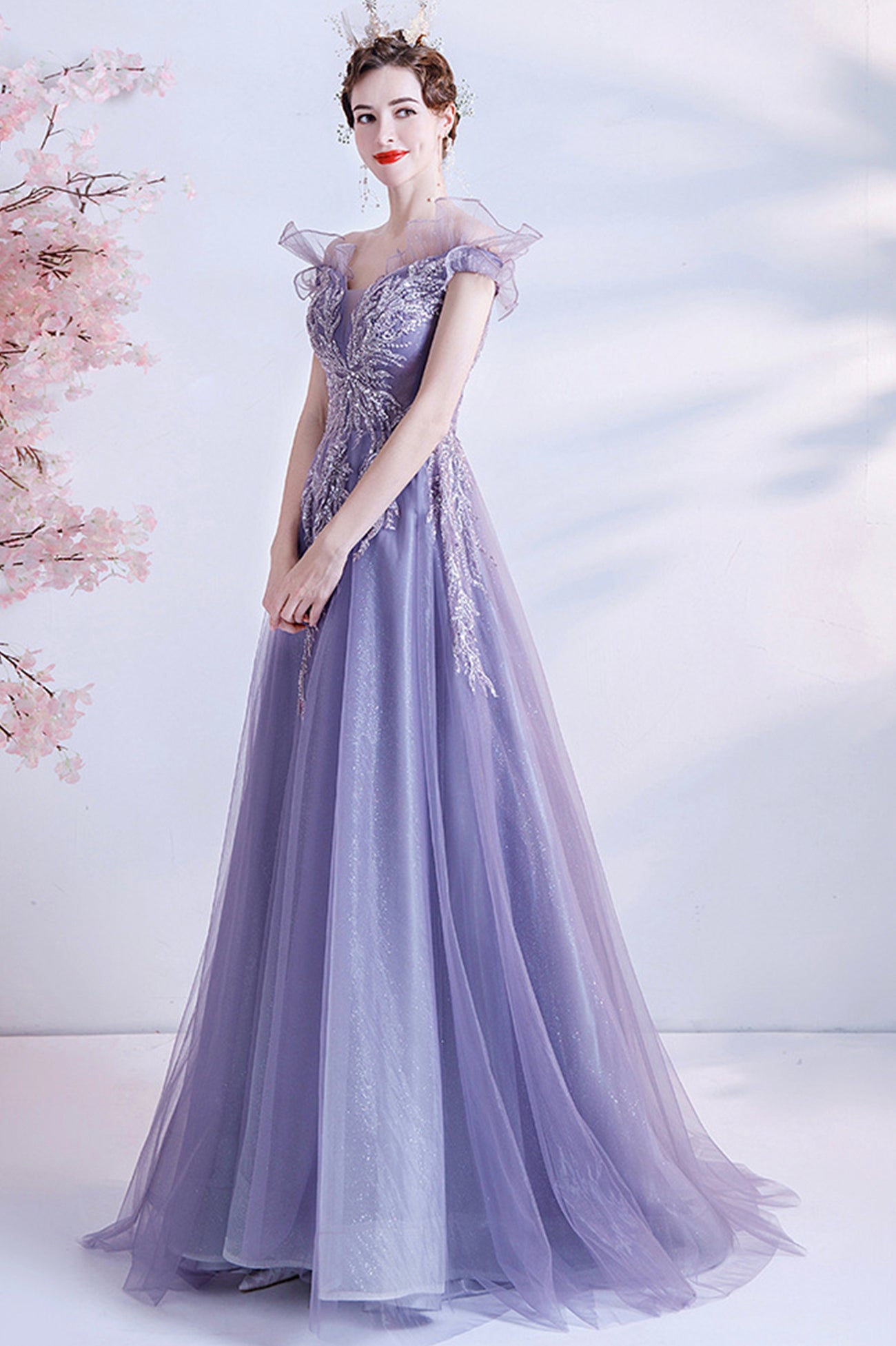 Purple Tulle Long A-Line Prom Dress with Sequins, Off the Shoulder Party Dress