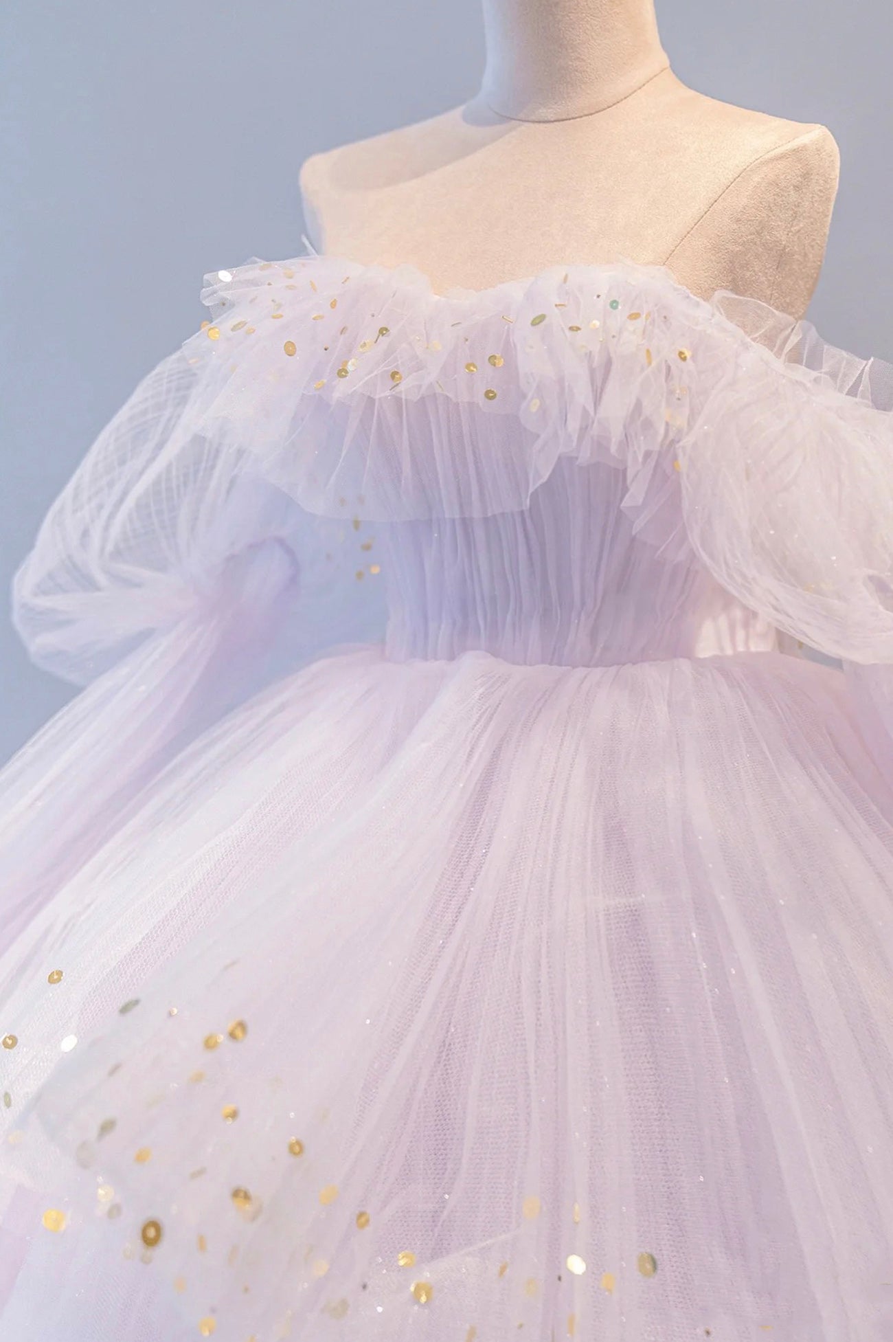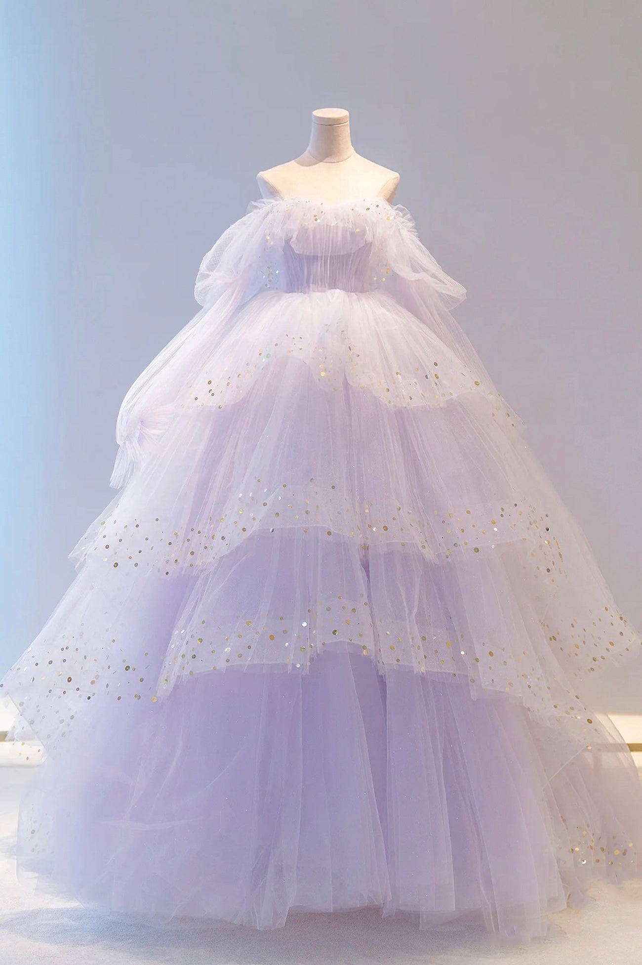 The Purple Tulle Layers Long A-Line Prom Dress is an enchanting choice for special evenings. Its A-line silhouette and cute long sleeves create a captivating look. The layers of purple tulle add depth and charm, making you the center of attention at any event. This gown beautifully blends elegance and charm for a memorable evening.