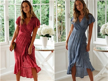 loveedsTM-Red Dot Print Boho Long Chiffon Summer Beach Elegant Midi Women's Dress Floral V-Neck Folds Ruffles Wrap Dresses Split Vestidos