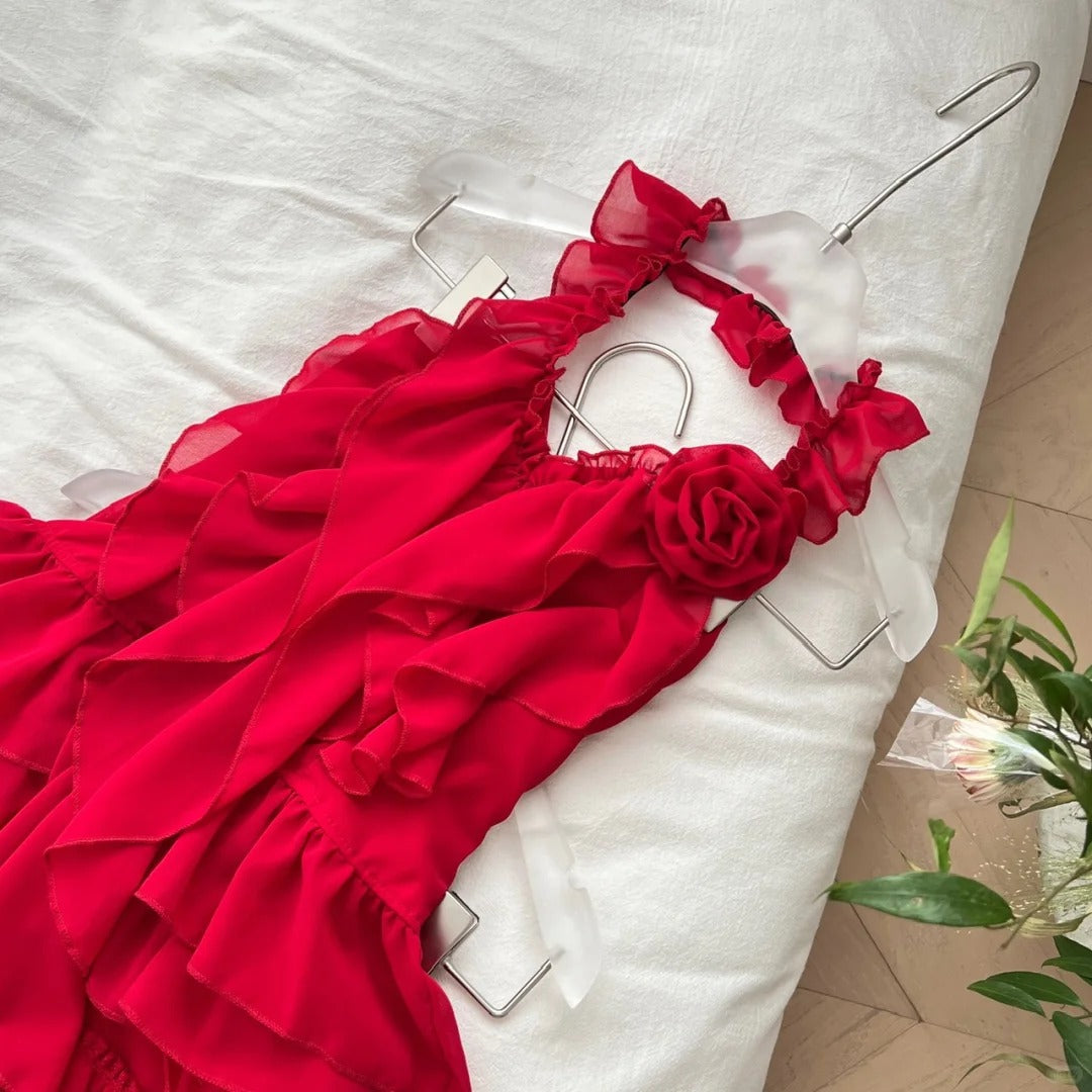 Red floral homecoming dress short chiffon summer beautiful seaside vacation sexy halterneck two piece set gh4561