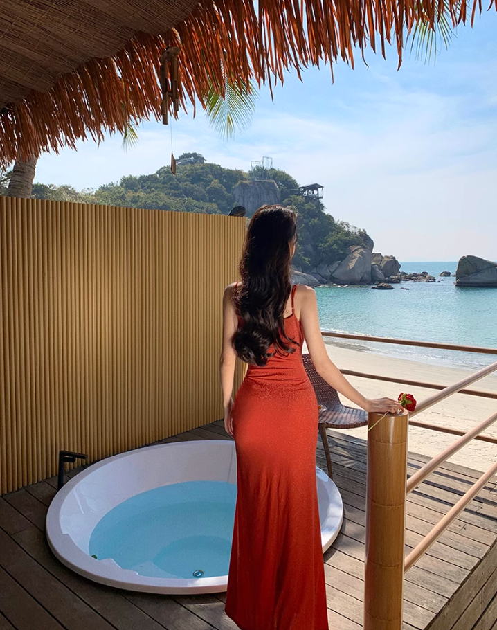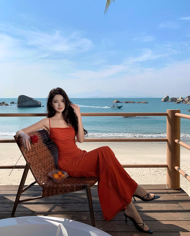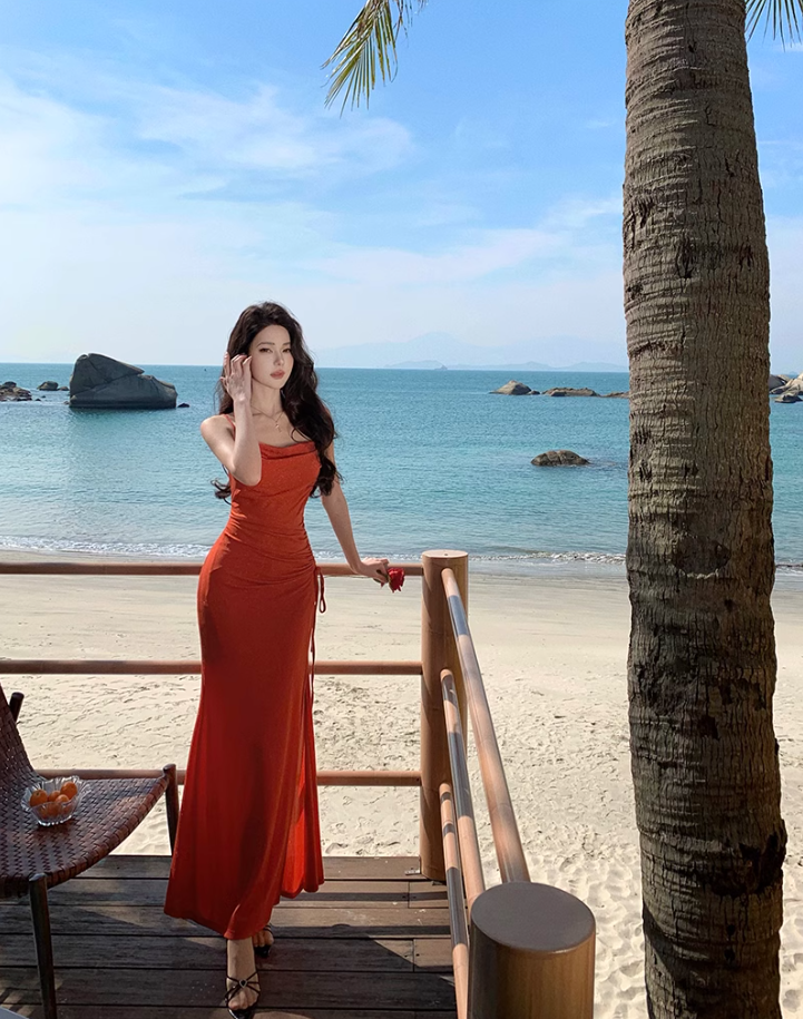 Red Swing Neck Shiny Silk Suspender Fishtail Skirt ED01196