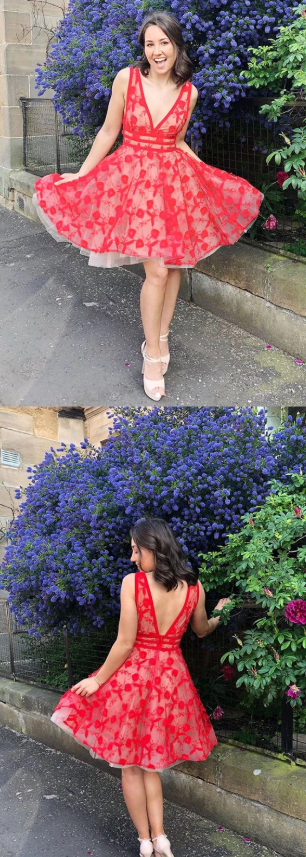Red v neck tulle lace short party dress, red homecoming dress cg4984