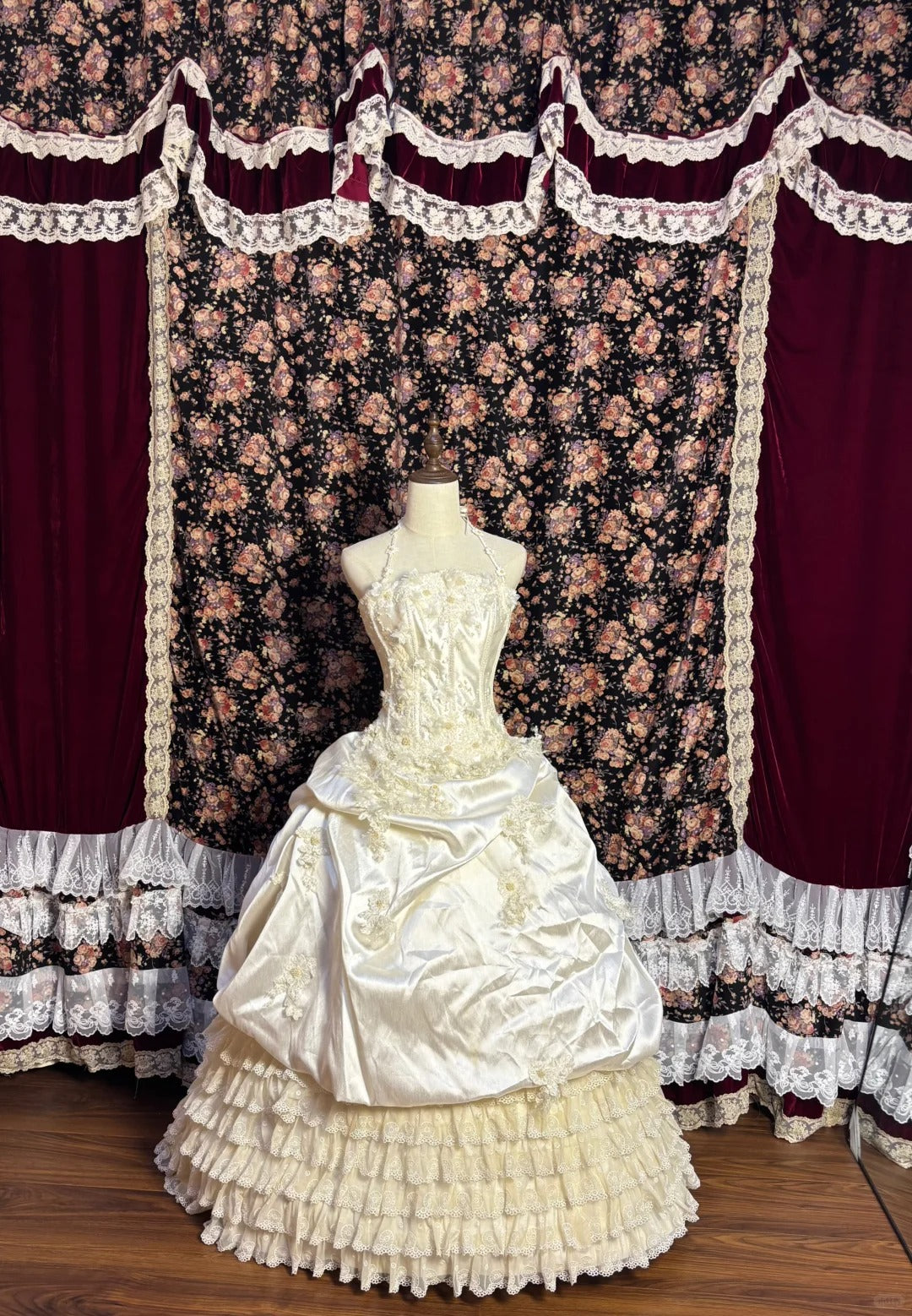 Retro Princess Halter Neck Beaded 3D Flower Satin Lace Edge Cake Skirt Wedding Dress P3021