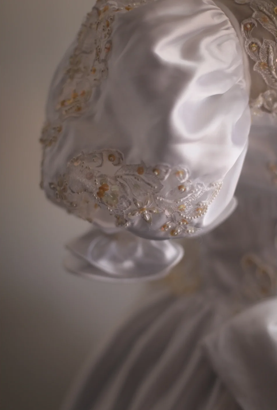 Retro Puff Sleeves Earrings Beaded Princess Wedding Dress with Train P2862