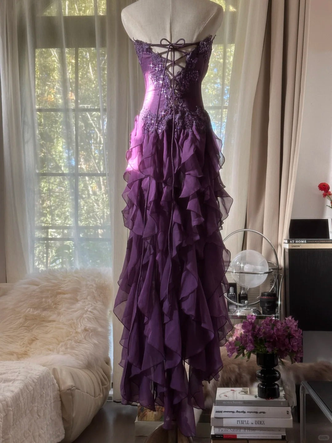 Retro Strapless Grape Purple Fungus Curled Skirt Chiffon Long Prom Dress P3346