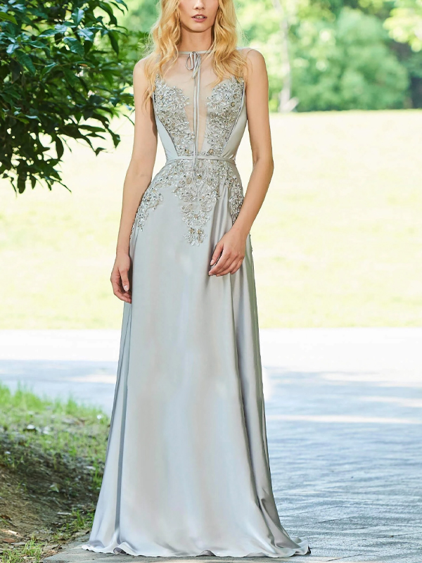 Round Neck Lace Solid Color Sleeveless Maxi Dress