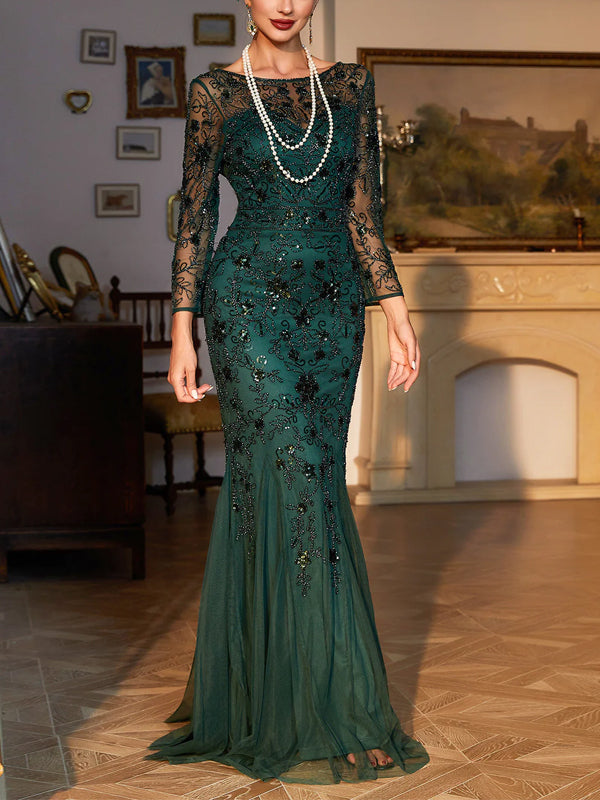 Round Neck Long Sleeve Mesh Sequins Solid Color Maxi Dress