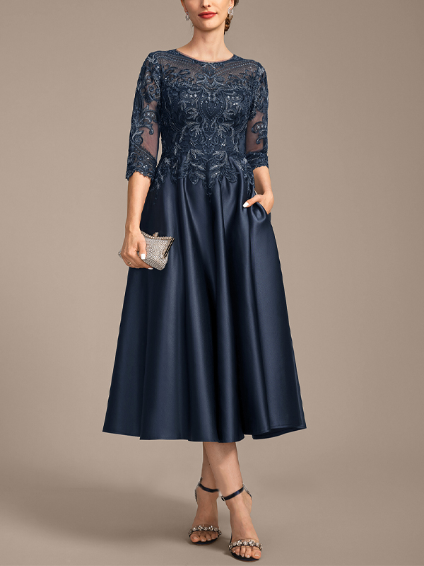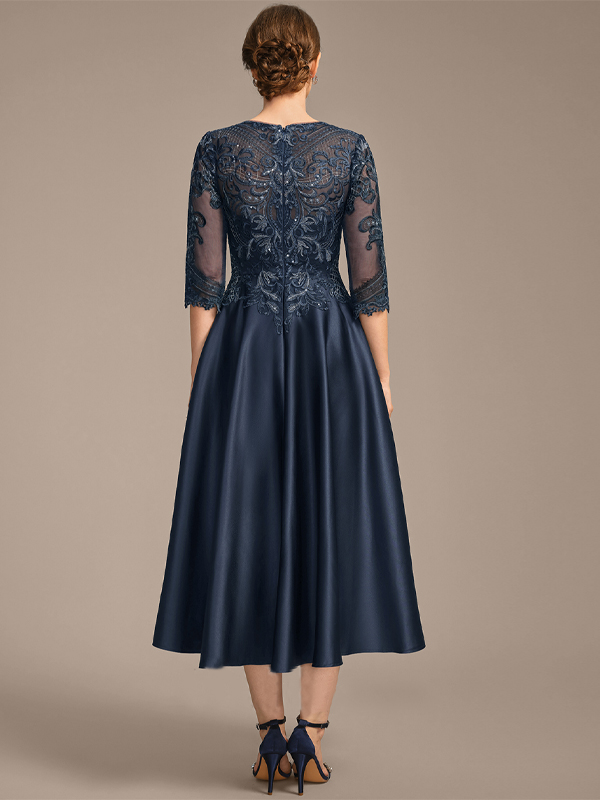 Round Neck Short Sleeve Lace Sequin Solid Color Midi Dress