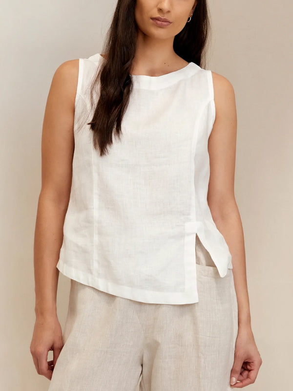 Round Neck Sleeveless Solid Color Cotton And Linen Top