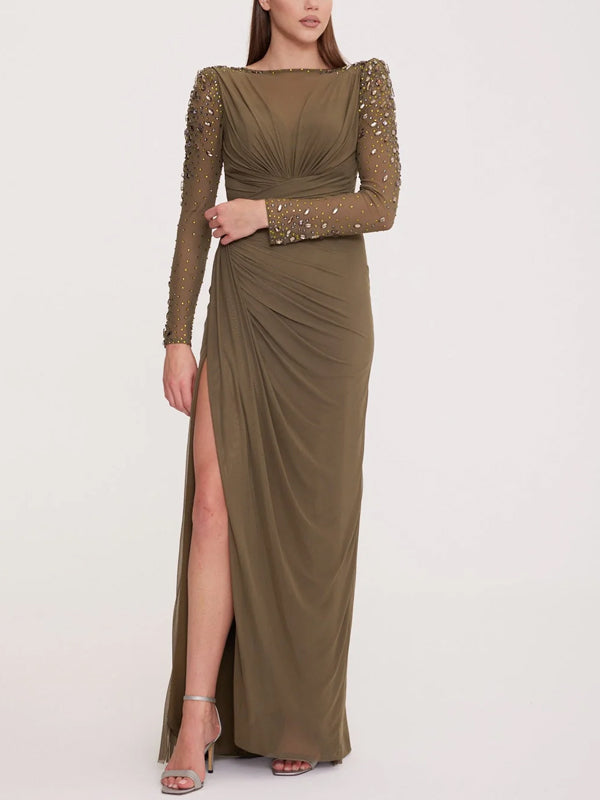 Round Neck Solid Color Sequined Chiffon Maxi Dress