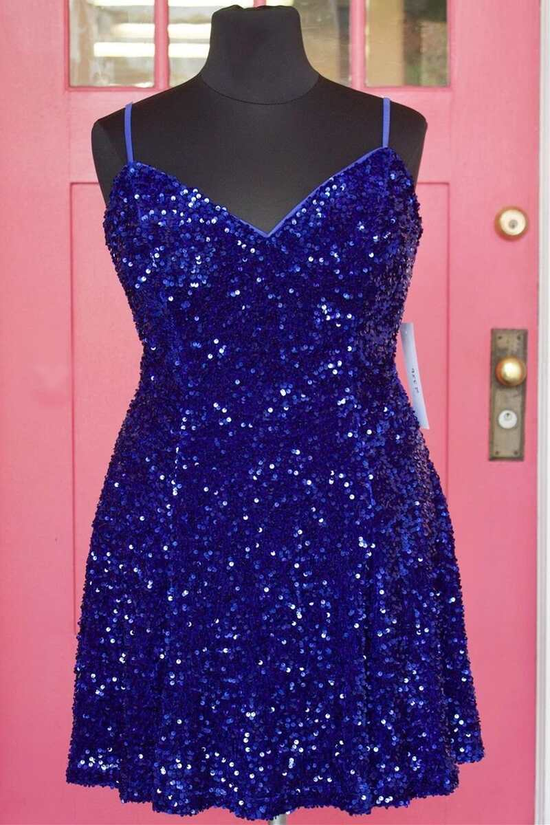 Royal Blue Sequin V-Neck Straps Lace-Up Back Homecoming Dress gh1456