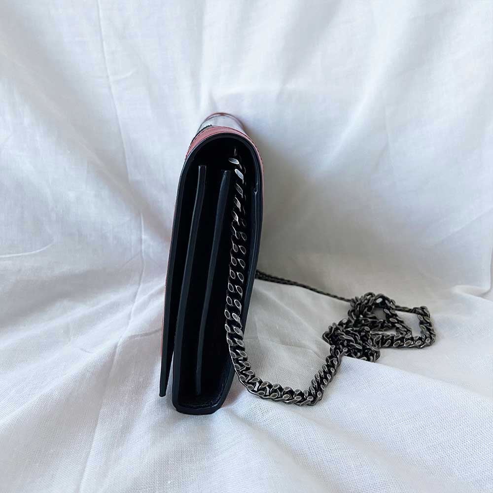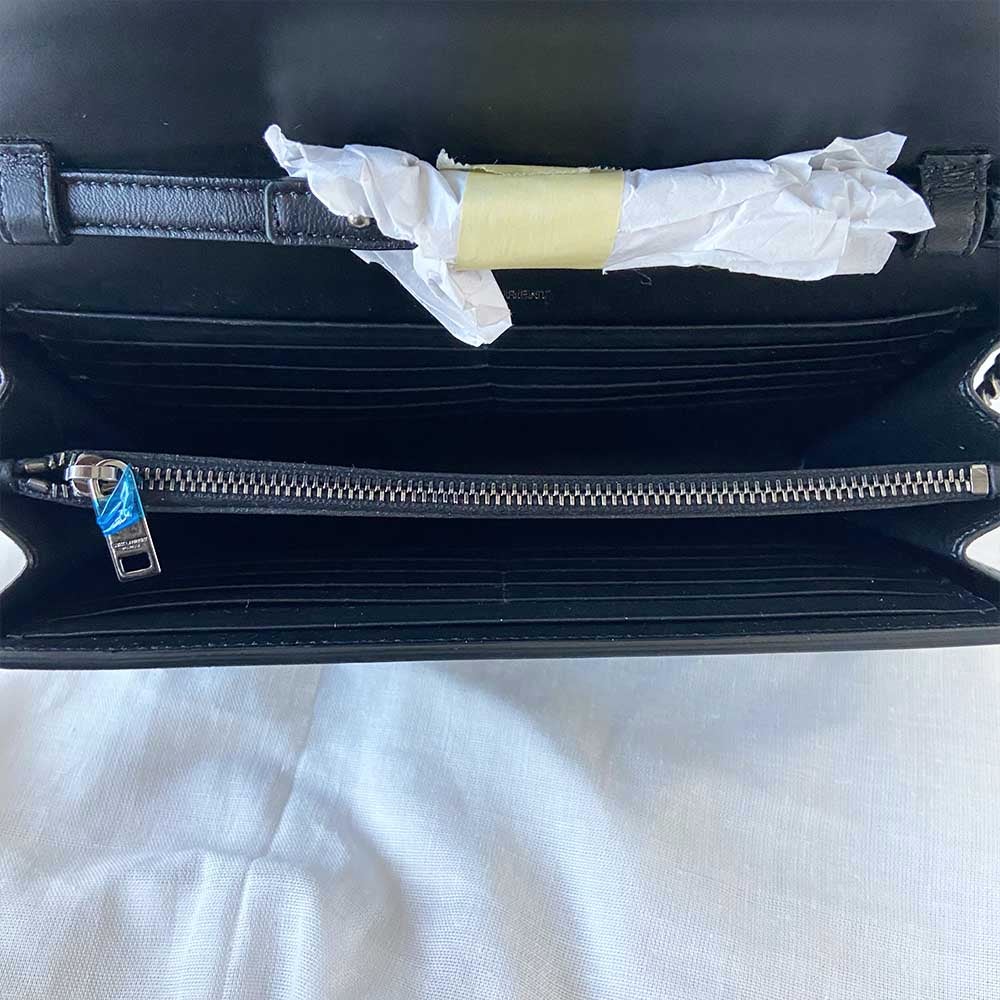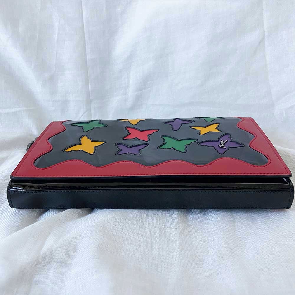 Description : Saint Laurent Bellechasse butterfly cutout black leather clutch with a chain, this playful accessory features a chain strap, a foldover top with snap closure, an interior zipped compartment and internal slip pockets.