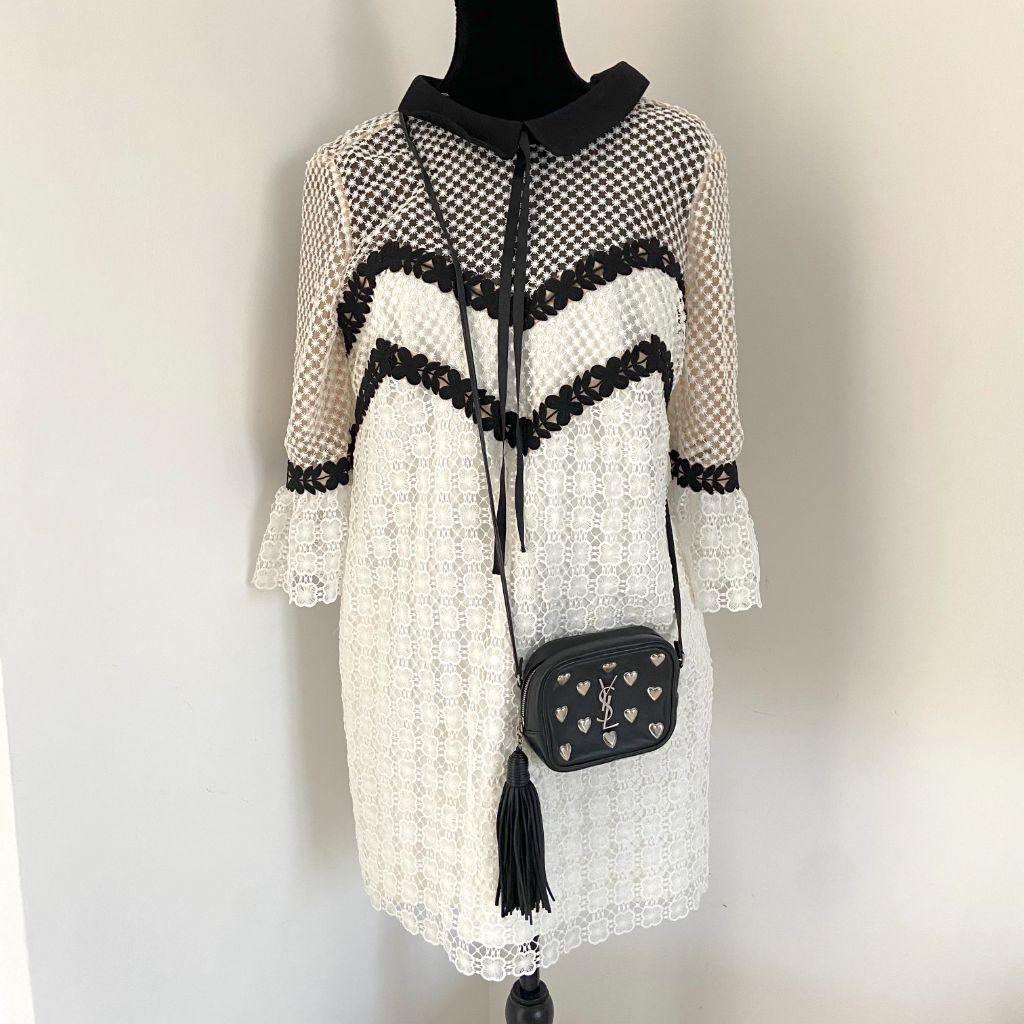 Saint Laurent Black Leather Monogram Heart Blogger Crossbody Bag, featuring tassel on zipper, the front has metal hearts and the YSL logo.