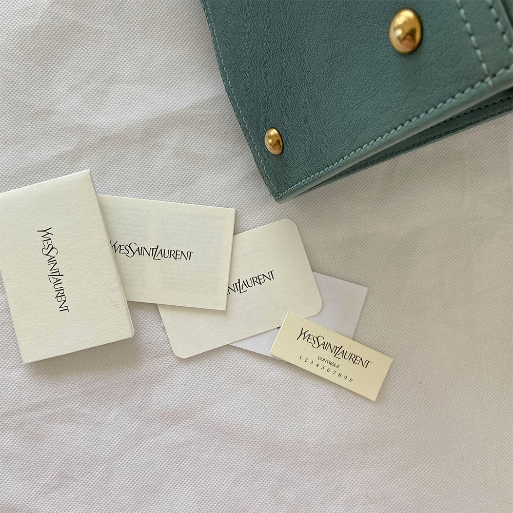 Description : Saint Laurent light blue leather medium Cabas Chyc Tote featuring cold-tone hardware, Y motif snap closure and dual-rolled handles. The top of the bag opens with zipper, with. Fabric lined interior with two open pockets and one zip pocket. Condition: stains on exterior leather, cracked leather on handles. Height without handle: 24 cm