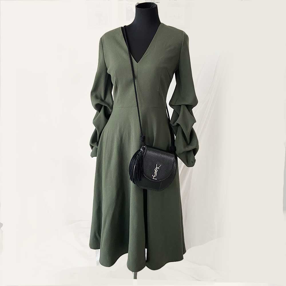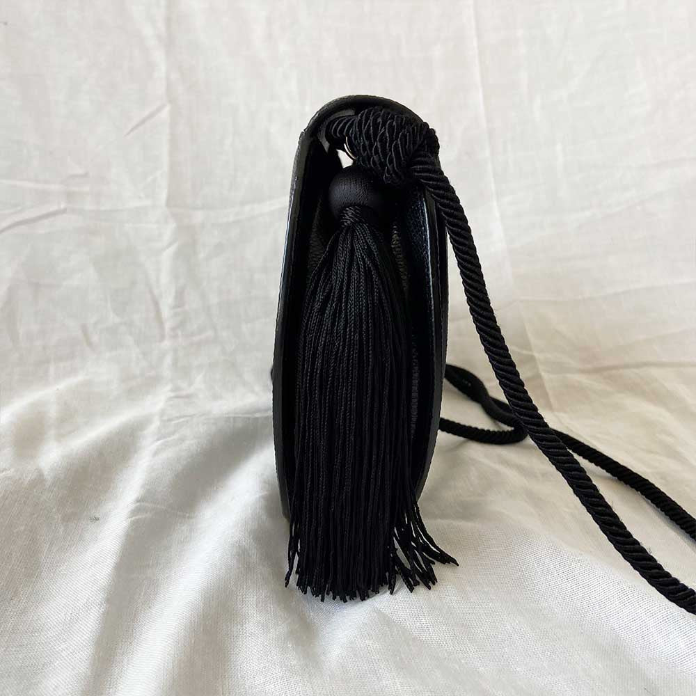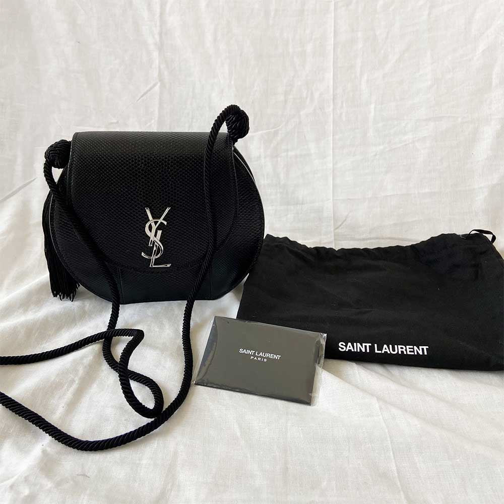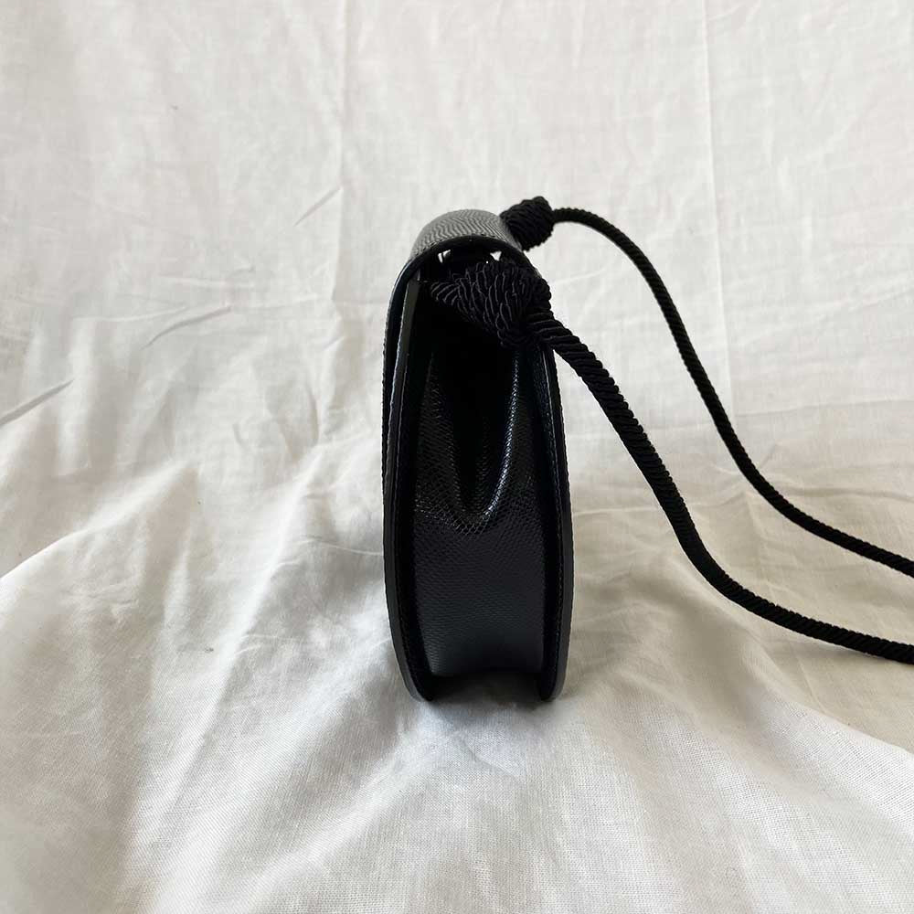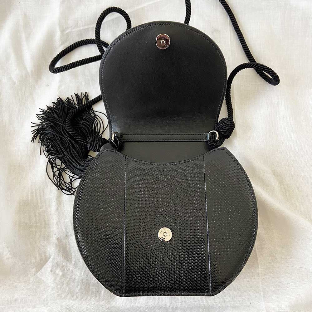 Description : Saint Laurent Demie Lune Minaudiére leather shoulder bag is Italian crafted with a lizard-embossed texture. Designed in a structured circular shape, this piece has a passementerie shoulder strap, tassel trim, fold over flap top, silver tone YSL monogram plaque, magnetic closure and flat base.
