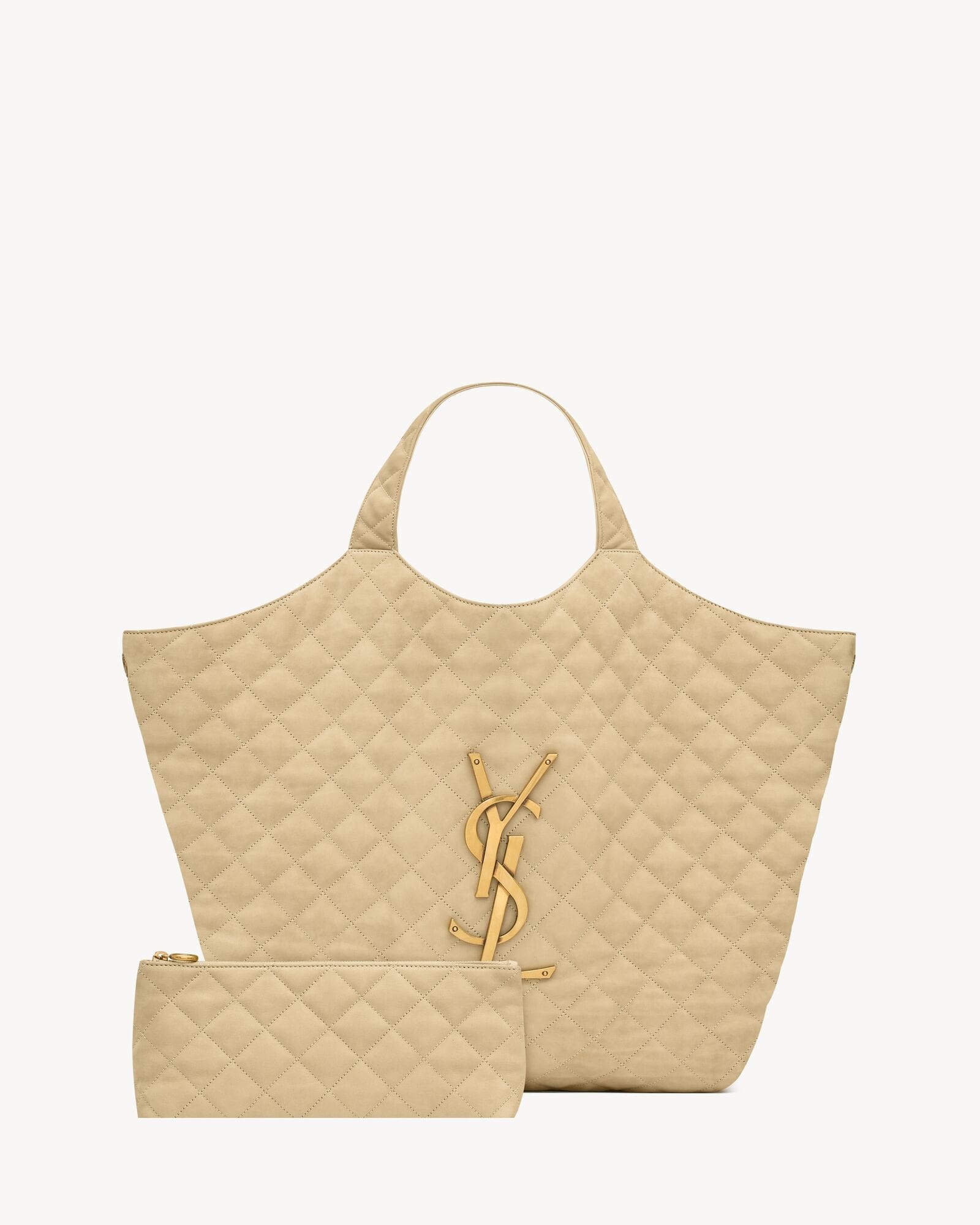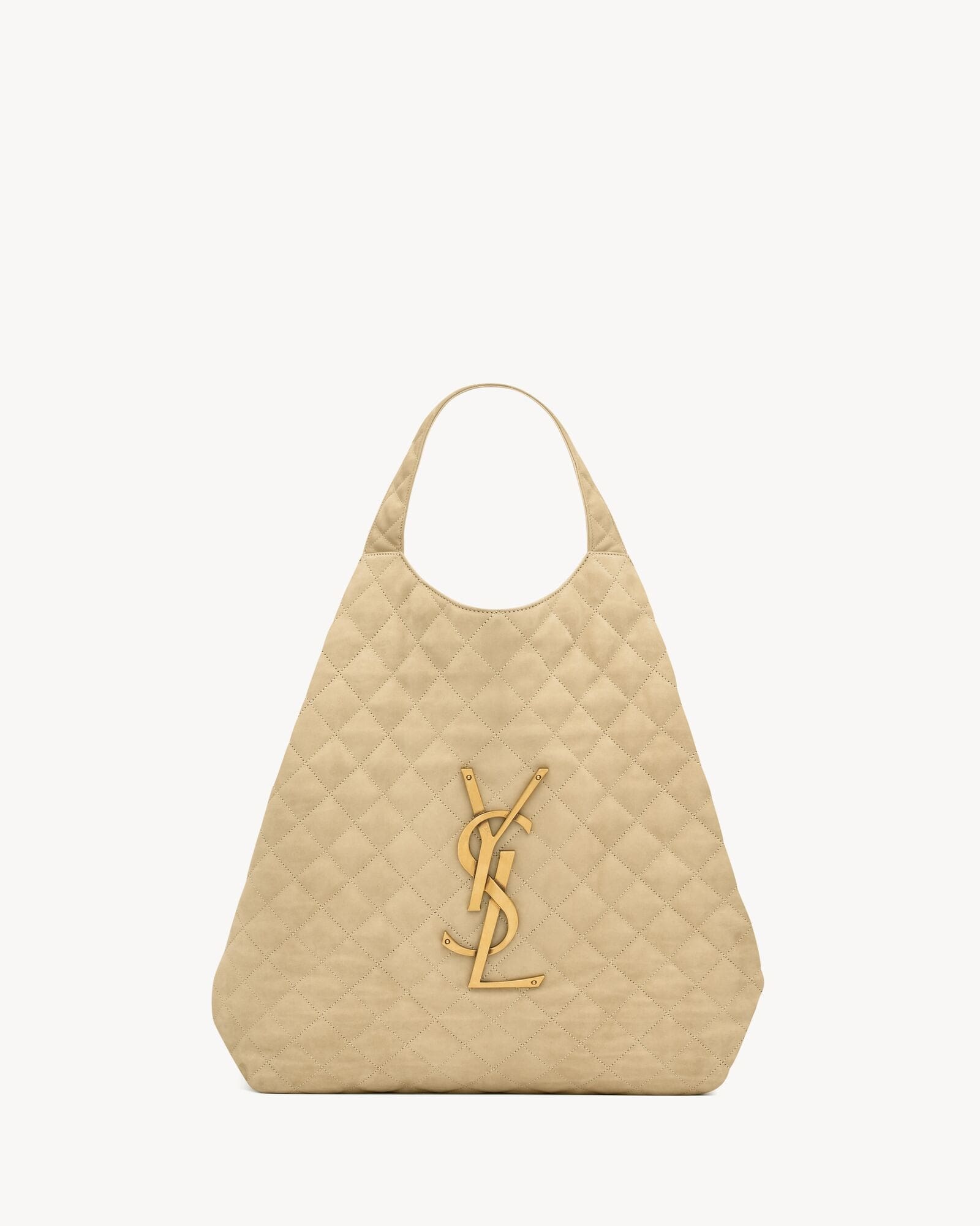 MAXI NUBUCK SUEDE TOTE WITH AN OVERSIZED CASSANDRE YSL EMBELLISHMENT.