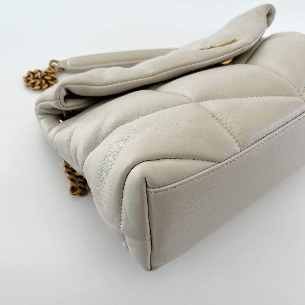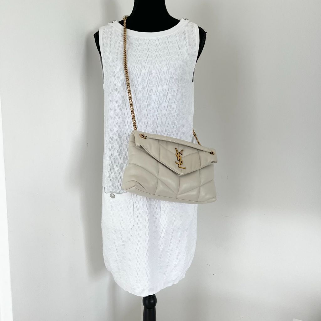 Saint Laurent LouLou white puffer quilted lambskin leather bag with gold hardware, with metal YSL initial on the front, crossbody strap that can be doubled and worn on the shoulder