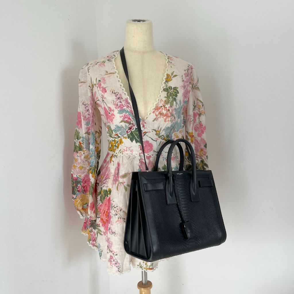 Saint Laurent black python embossed Sac De Jour shoulder bag, double top handles with suede lined interior. Middle zipped partitioned pocket with two open pockets on one side and one zip pocket on the other