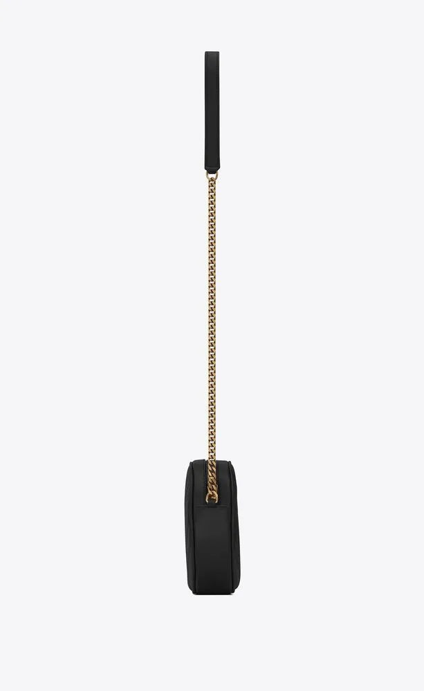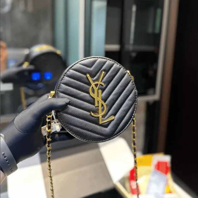 ROUND CROSSBODY CAMERA BAG DECORATED WITH CHEVRON QUILTED OVERLOCK SEAMS AND METAL YSL MONOGRAM, WITH CHAIN AND LEATHER SHOULDER STRAP.