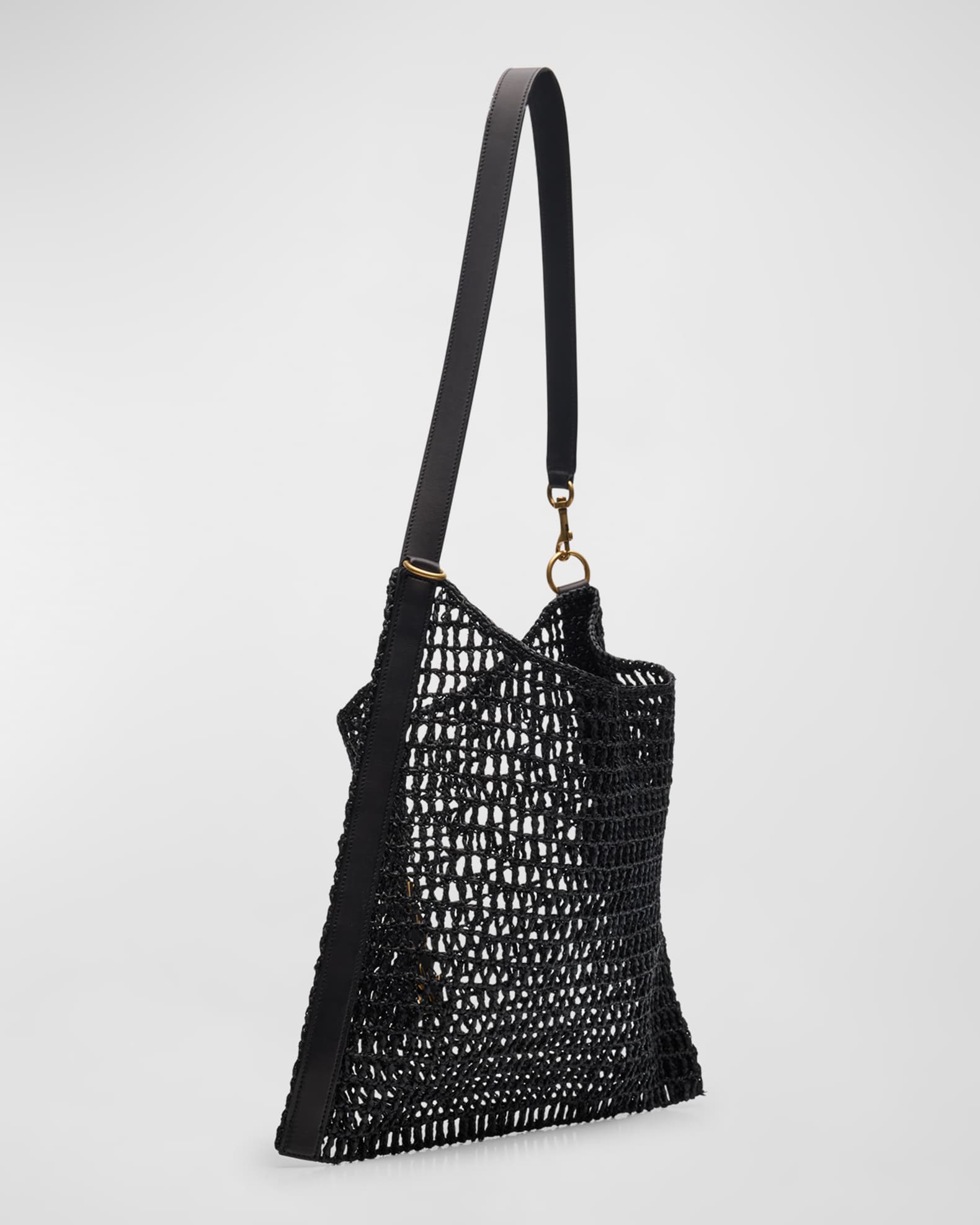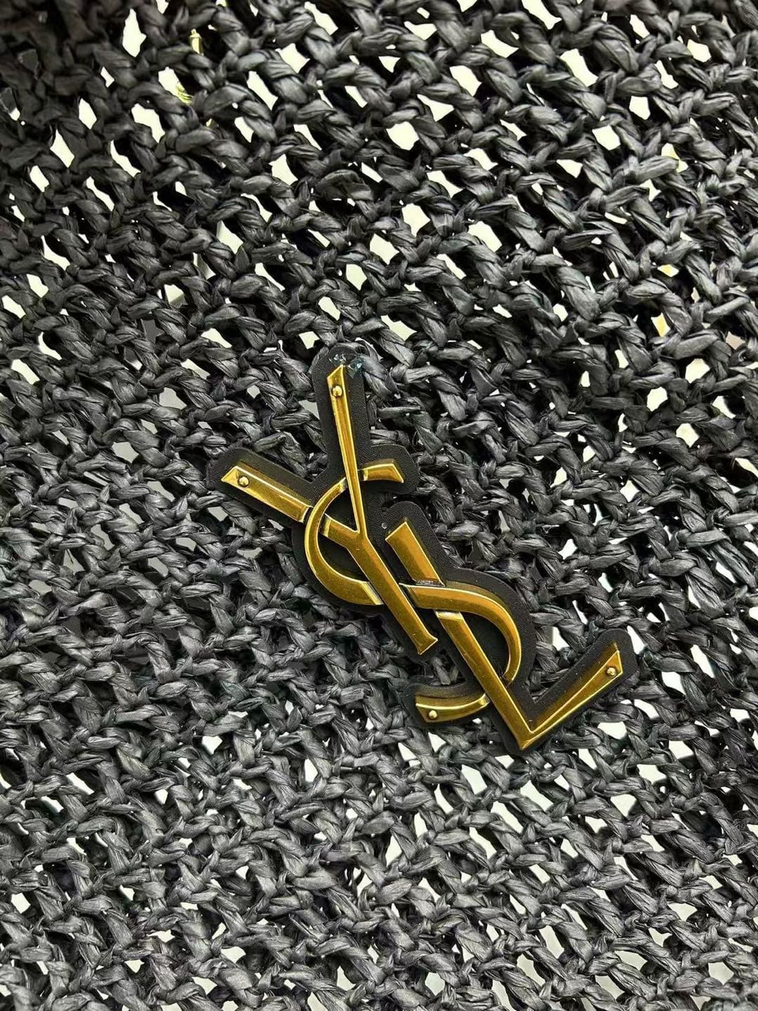 Saint Laurent “Xalis” shoulder bag in raffia macramé and viscose Gold-tone Cassandre hardware on the front Leather shoulder strap; 28.3″ drop Open top Approx. 14.6″H x 15.7″W x 1.2″D/37 x 40 x 3 cm