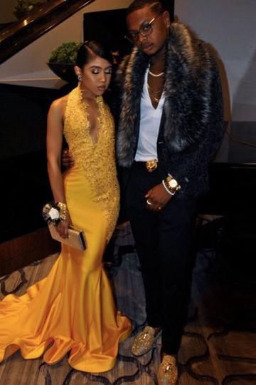 Satin Floor-Length Halter Prom Dresses Appliques Lace cg4840