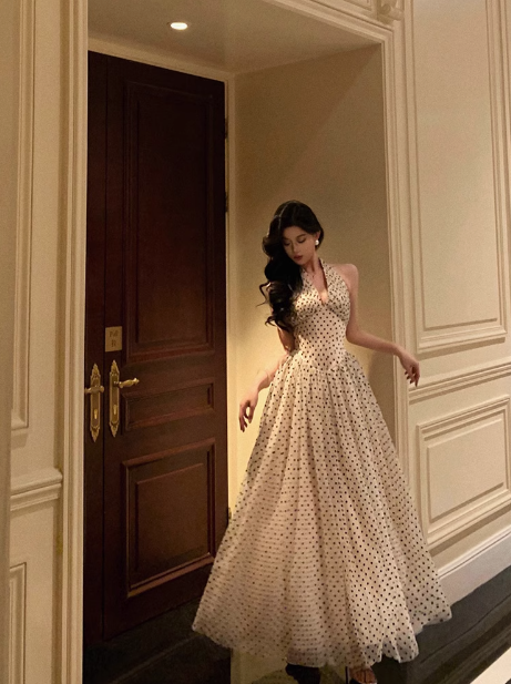 Sexy A line Halter Polka Dot Halter Neck 18th Birthday Dress Long Party Birthday Outfits For Women DP0160