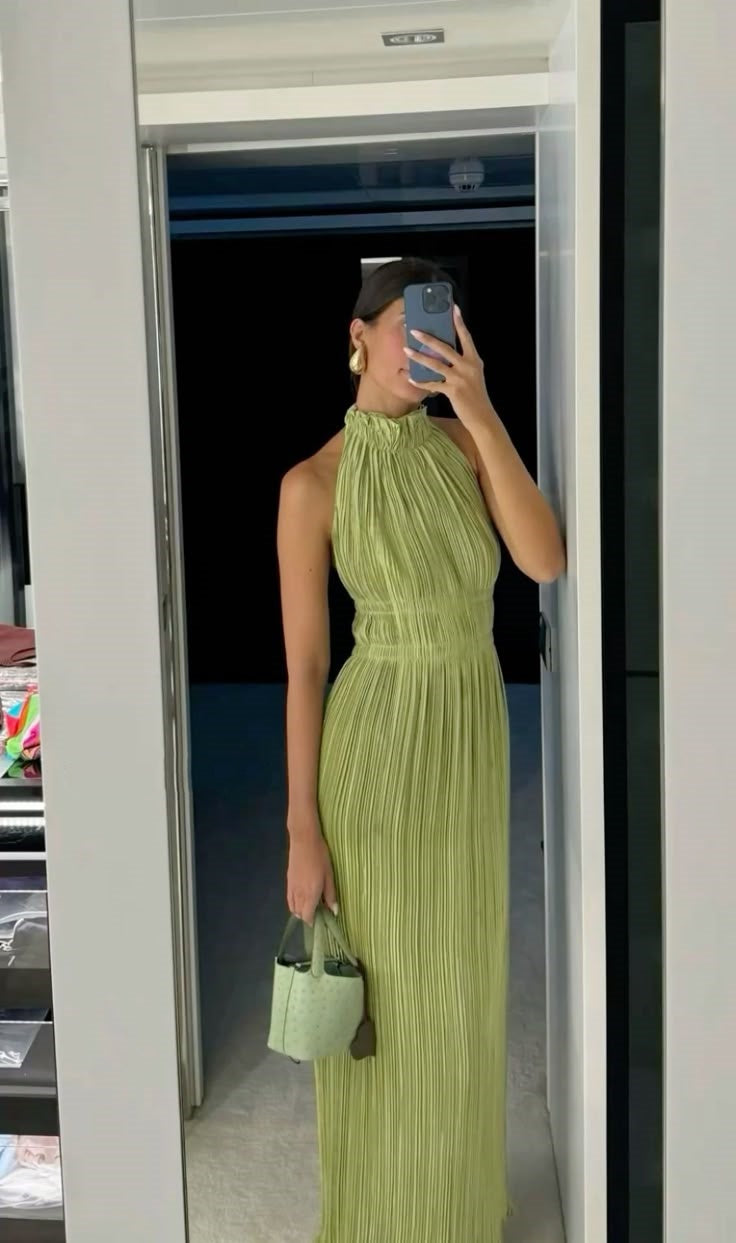 Sexy A line High Neck Sage Green Chiffon Prom Dresses Formal Summer Wedding Guest Dresses Wedding Guest Outfit W0162