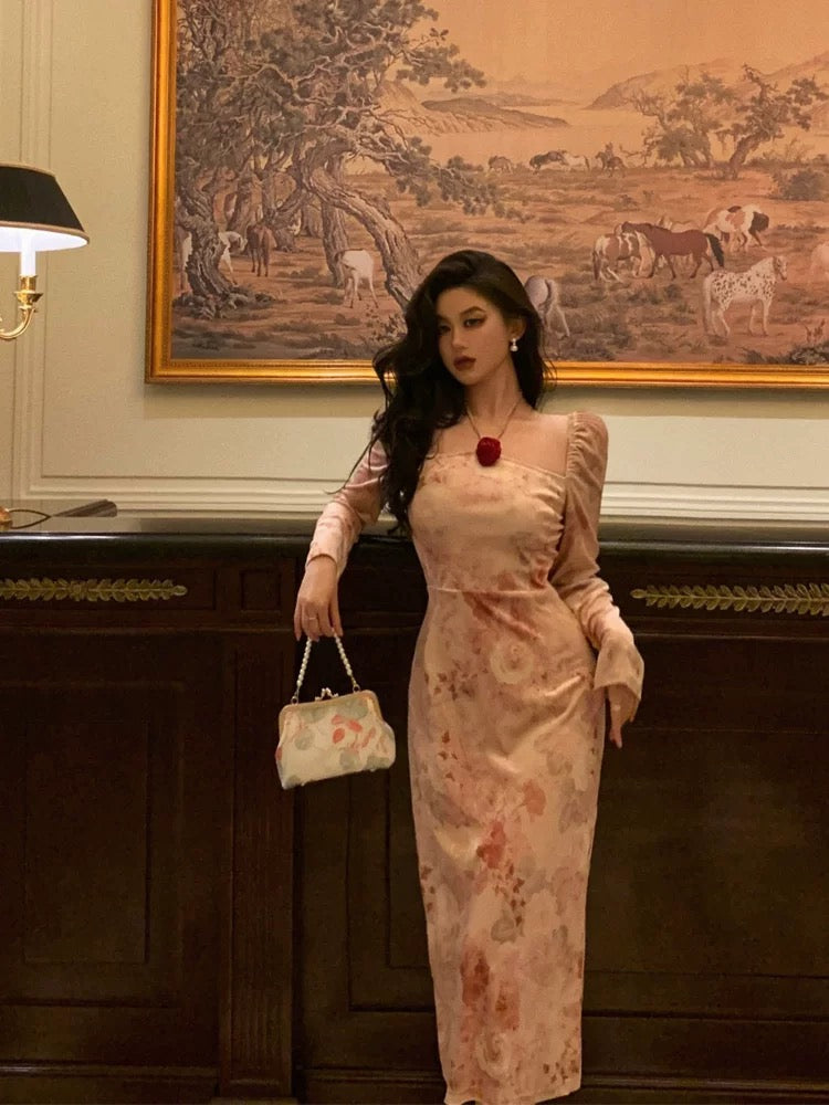 Sexy A Line Square Neckline Long Sleeves Pink Floral Prom Dresses Birthday Outfits Evening Gown SD921