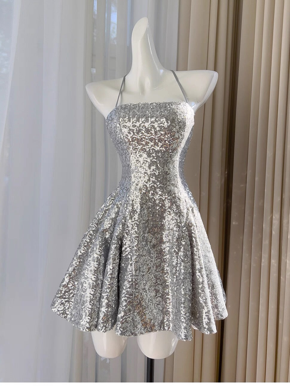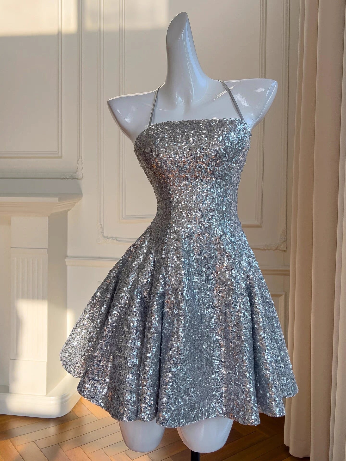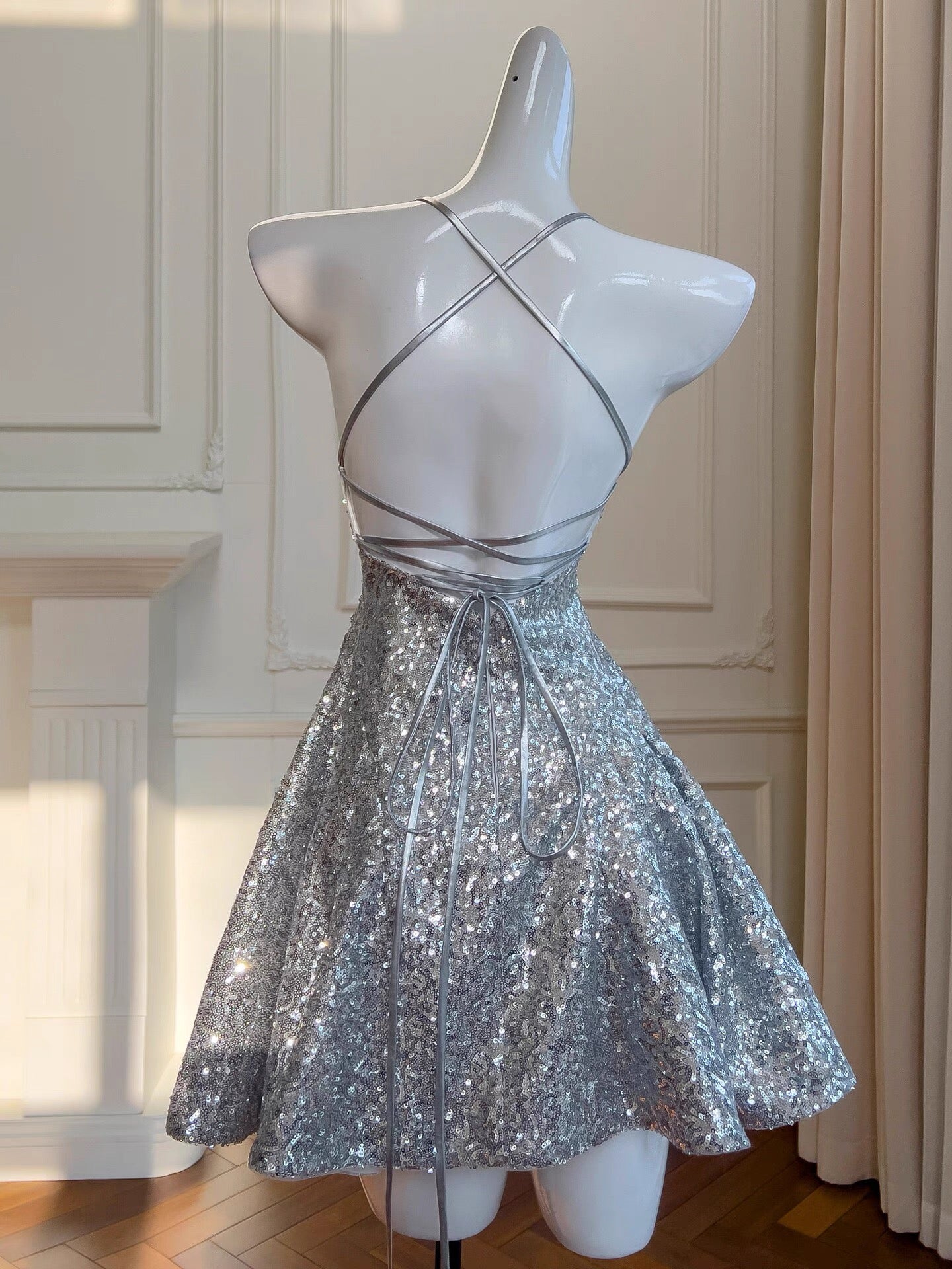 Sexy Ball Gown Halter Sequin Silver Backless Short Mini Formal 8th Grade Homecoming Dresses Middle School Short Birthday Gowns Graduation Dress Hoco Outfits DH2121