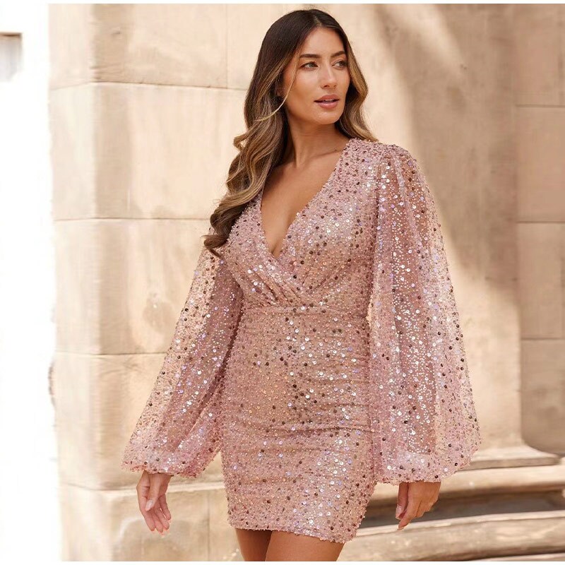 loveedsTM-Sexy Bright Sequin Lantern Long Sleeve Dress Summer Fashion Slim Nightclub Party Dresses Female V Neck Bodycon Mini Robe
