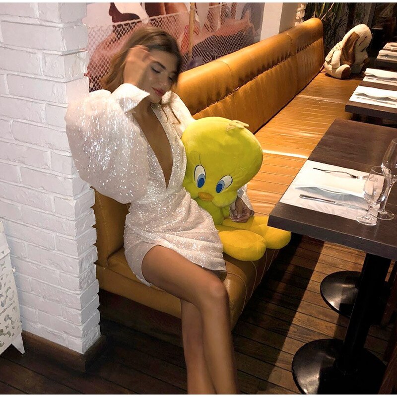 Sexy Bright Sequin Lantern Long Sleeve Dress Summer Fashion Slim Nightclub Party Dresses Female V Neck Bodycon Mini Robe
