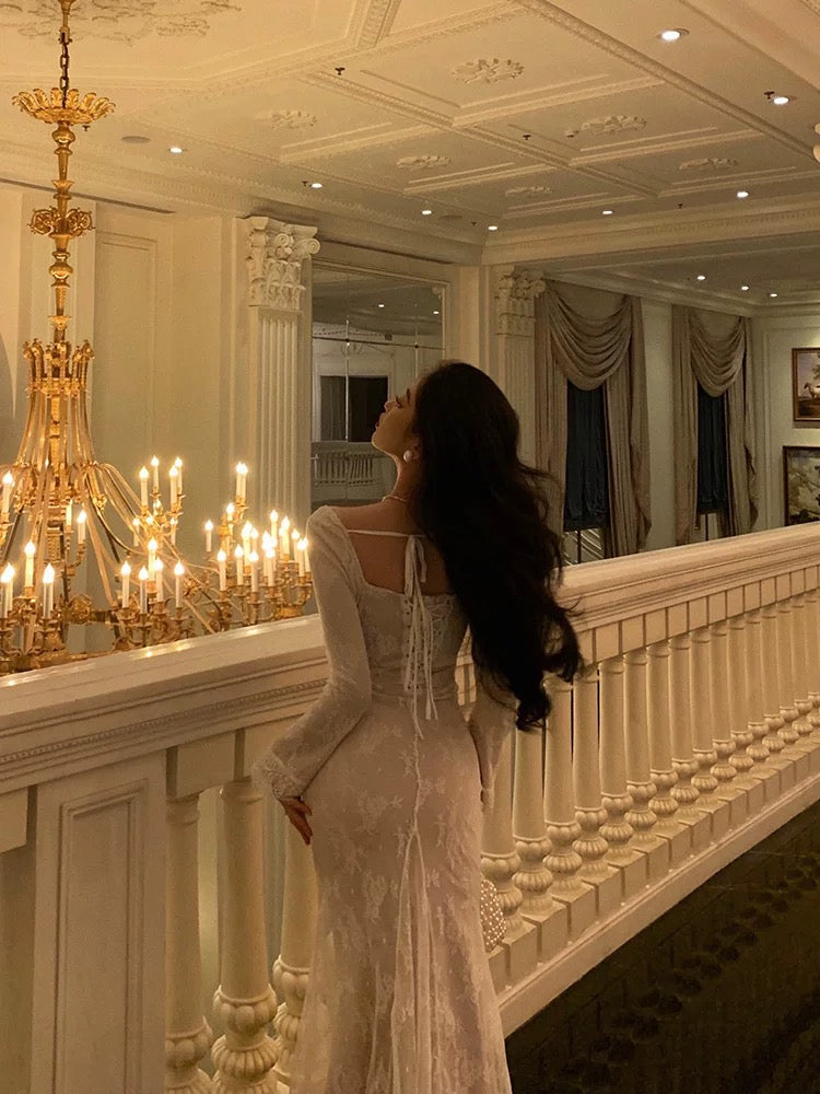 Sexy French Mermaid Square Neckline Lace White Prom Dresses Birthday Outfits Evening Gown SD1049