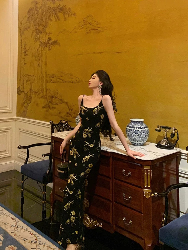 Sexy Mermaid Spaghetti Straps Floral Black Prom Dresses Ankle Length Birthday Outfits SD687