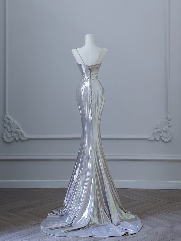 Sexy Mermaid Spaghetti Straps Silver Sequin Long Prom Dresses S3820